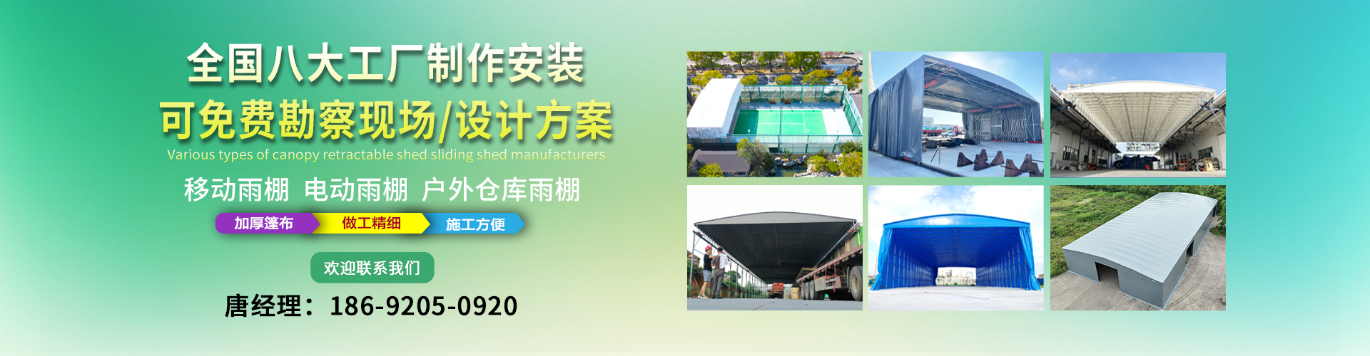 湖南鑫建華鋼結構工程有限公司是一家電動雨棚、膜結構車棚研發(fā),生產銷售,施工安裝于一體的專業(yè)鋼結構科技公司,主要產品有伸縮雨棚,電動雨棚,膜結構車棚等。 湖南地區(qū)職員目前有200多人,自建廠房15600平方米,配備先進的生產流水線,使每件品質產品的堅實基礎。 公司在衡陽,蘇州,天津,濟南,鄭州,江門,佛山,武漢,重慶均設有服務工廠,擁有專業(yè)的技術團隊,配備先進的設備和流水線生產,產能高,貨源充足,發(fā)貨速度快,服務區(qū)域廣。 移動伸縮棚適用于通道臨時倉儲、戶外運動遮陽、污水池遮蓋、能源交通、熱力化工、礦山、船舶制造及市政建設、物流、碼頭等領域的構件制作加工,成品半成品存放、倉庫、野外儀器設備操作用房等。尤其是對工廠發(fā)貨、倉儲臨時遮雨防嗮,梅雨期較長、建設周期較短的工程施工等特別適用。還可根據用戶需求量身定制、適合企業(yè)所需不同款式的產品。 我公司堅持“誠信社會為本,客戶滿意為榮”的經營理念,做到質量把控,嚴格管理,精益求精,恪守承諾。使鑫建華逐步走向成熟,其系統(tǒng)化、專業(yè)化日趨完善。以專業(yè)的技術、科學的管理,更高的產品質量,優(yōu)良的企業(yè)信譽,真誠的客戶服務,靈活多樣的經營方式和務實創(chuàng)新的企業(yè)精神愿與社會各界攜手合作,為推動智能鋼結構建筑事業(yè)的發(fā)展而不斷努力。...